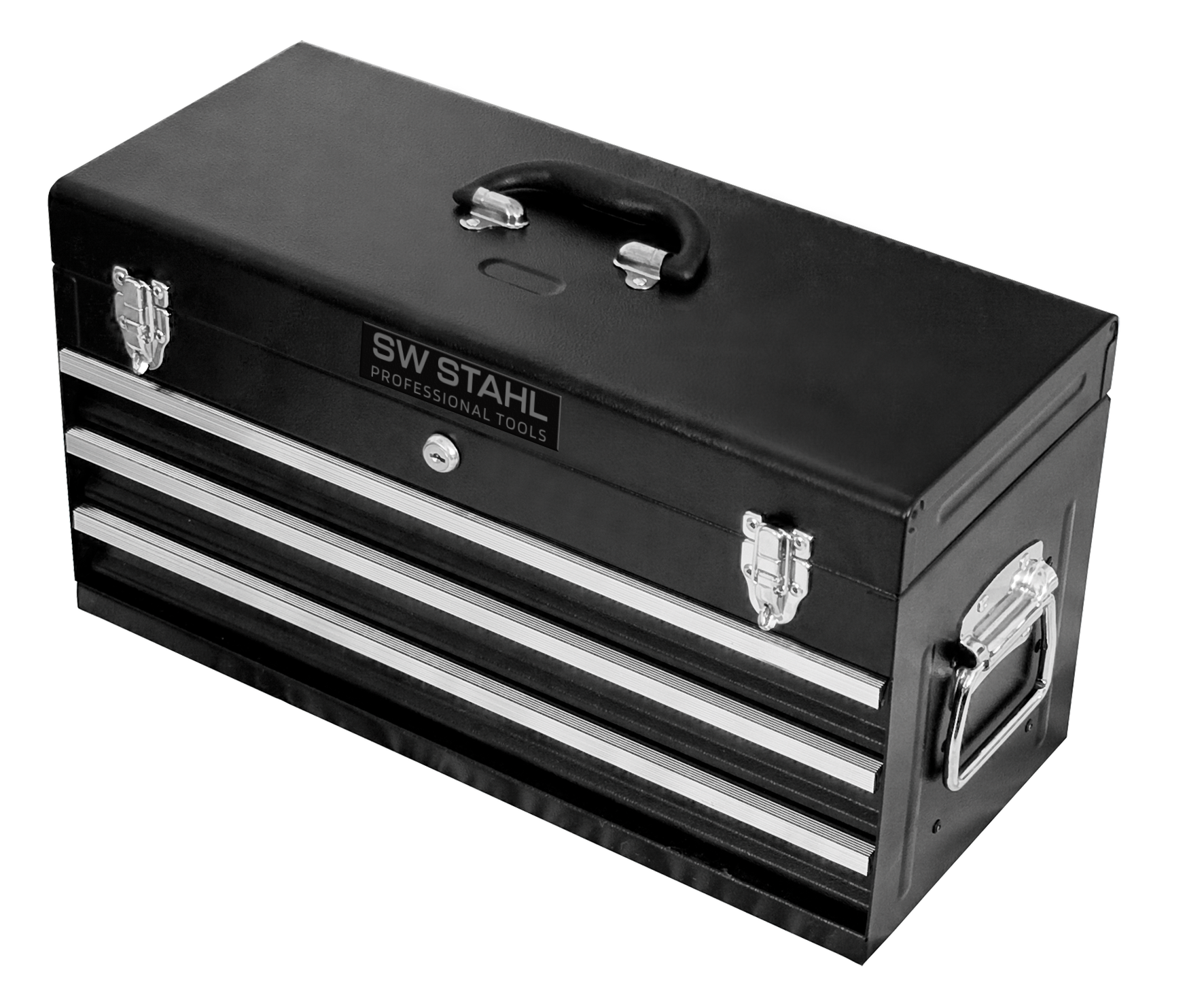mit drei Auszügen und Deckelfach, abschließbar, zentrale Verriegelung der Schubladen beim Schließen des Deckels. Stabil durch höhere Materialstärke.